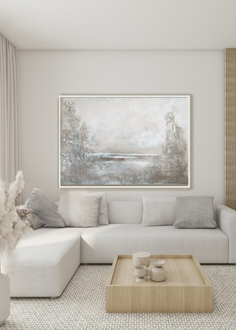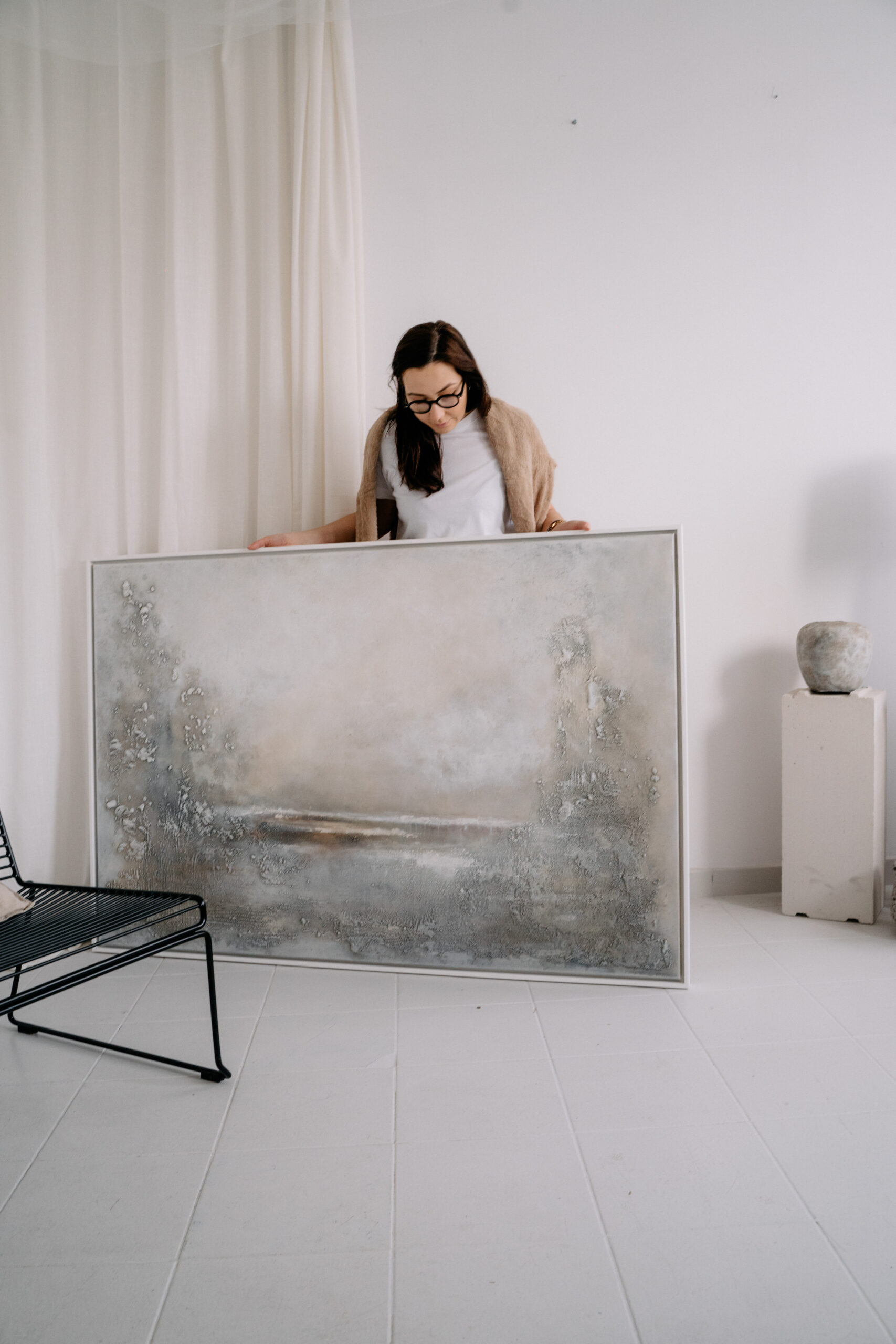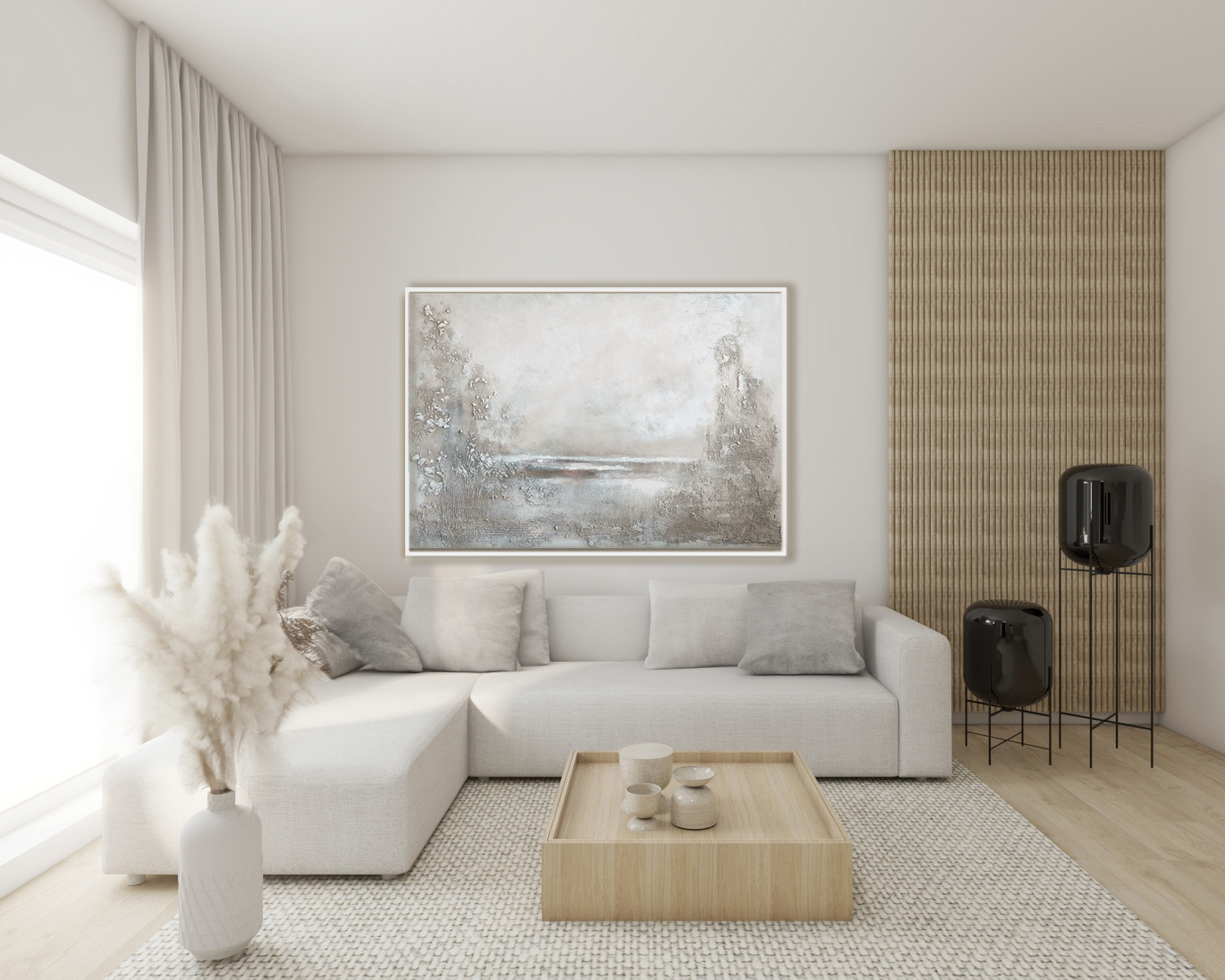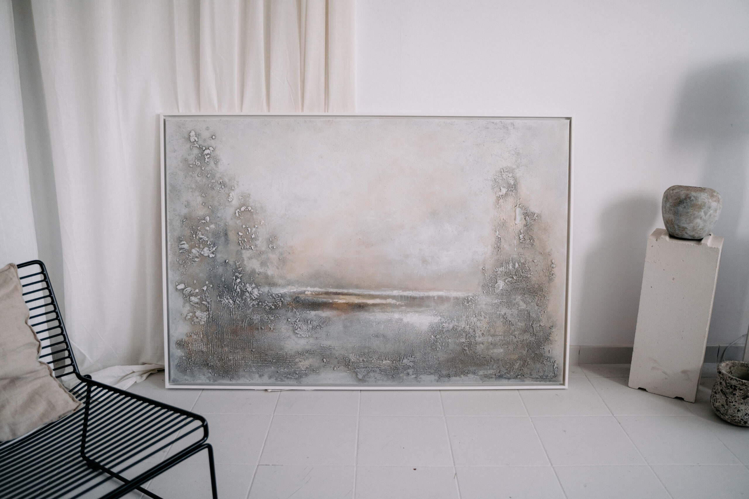 Obraz widoczny na zdjęciu, utrzymany w subtelnych odcieniach szarości, beżu i bieli, emanuje spokojem i introspekcją. Delikatne przejścia tonalne i fakturalna powierzchnia przywodzą na myśl poranną mgłę unoszącą się nad spokojnym morzem lub ciche wspomnienie zapisanego w pamięci miejsca. Szarości symbolizują równowagę, refleksję i dystans od zgiełku codzienności. To kolor kontemplacji, przestrzeni między światłem a cieniem, w której można odnaleźć ukojenie i klarowność myśli.