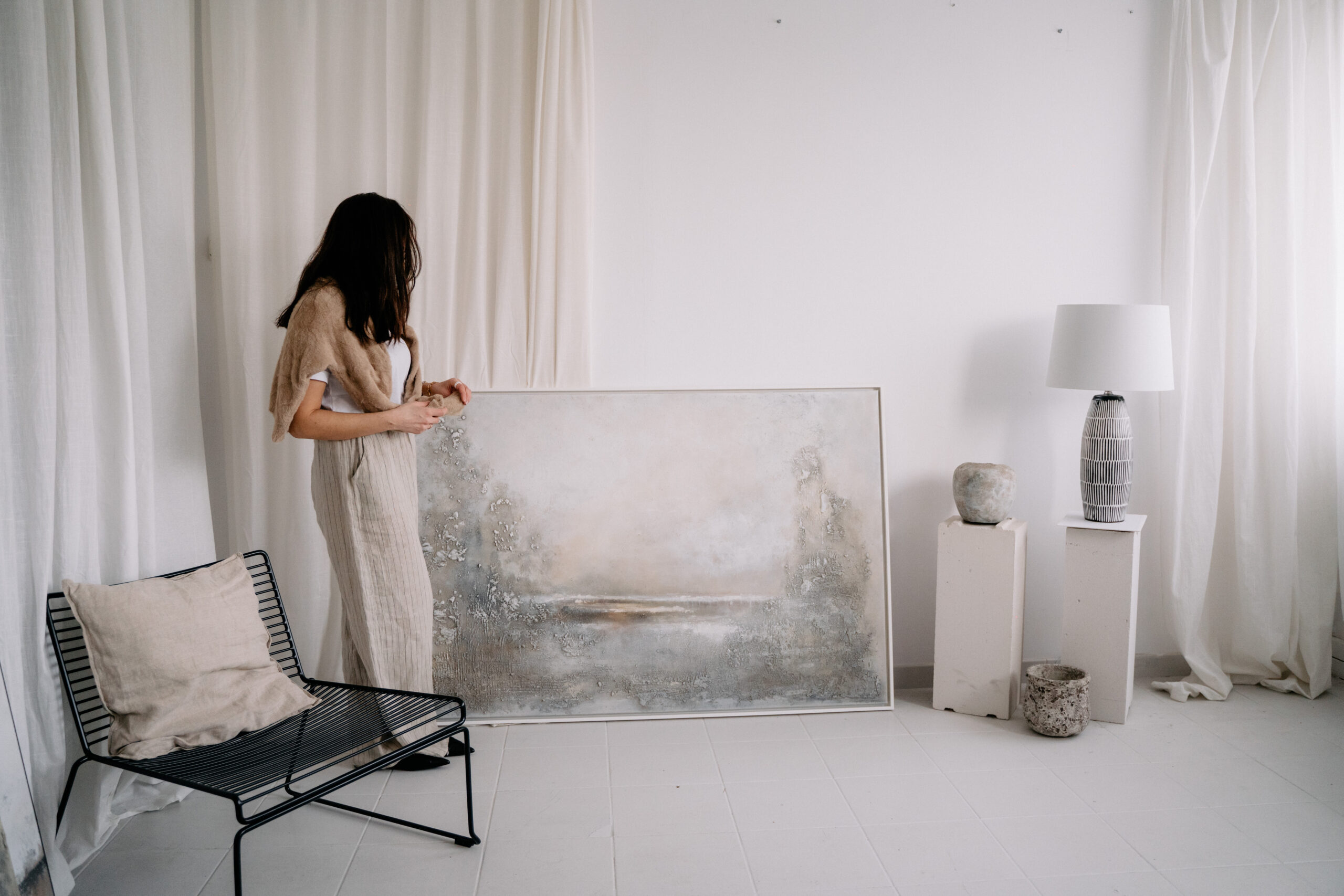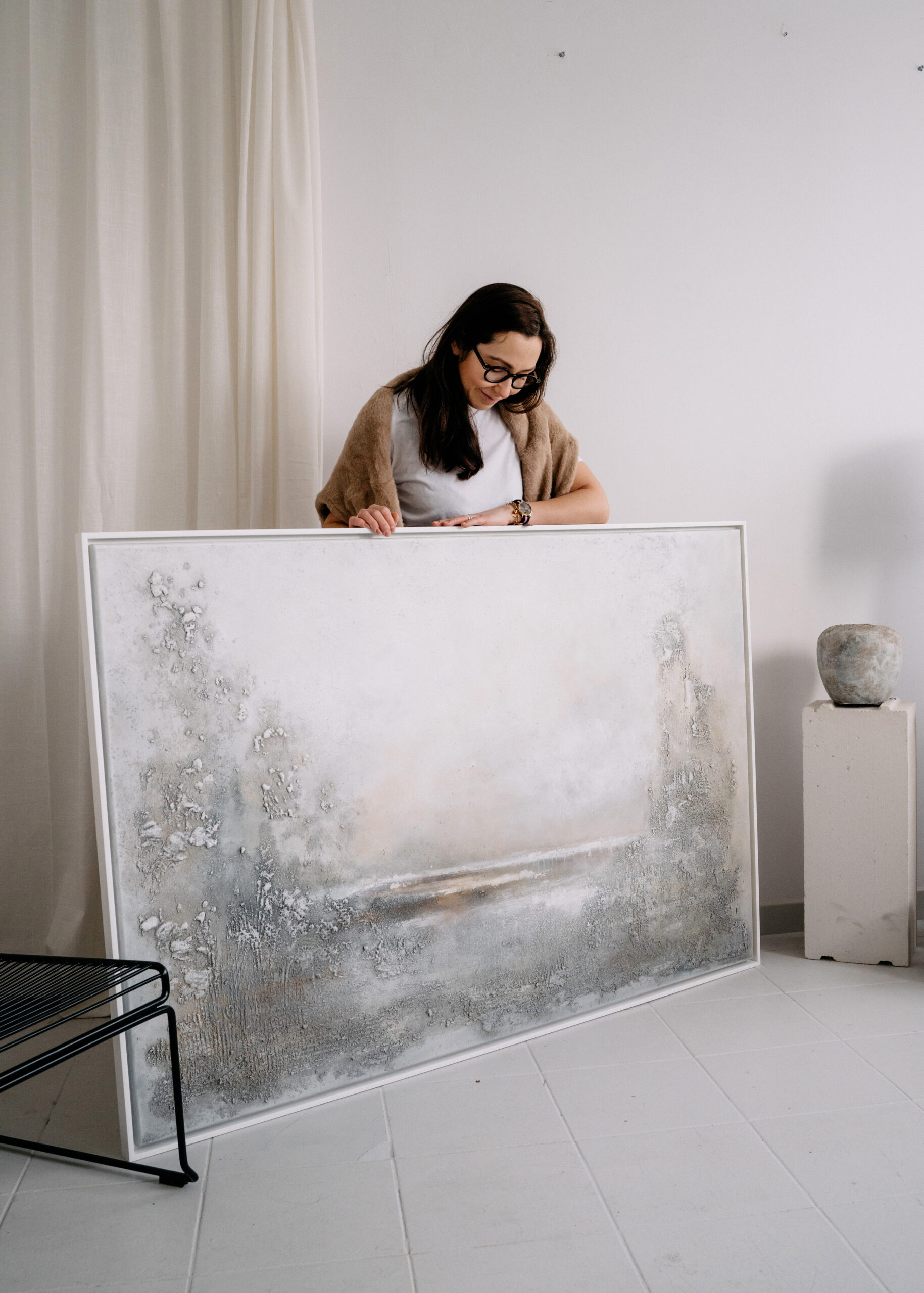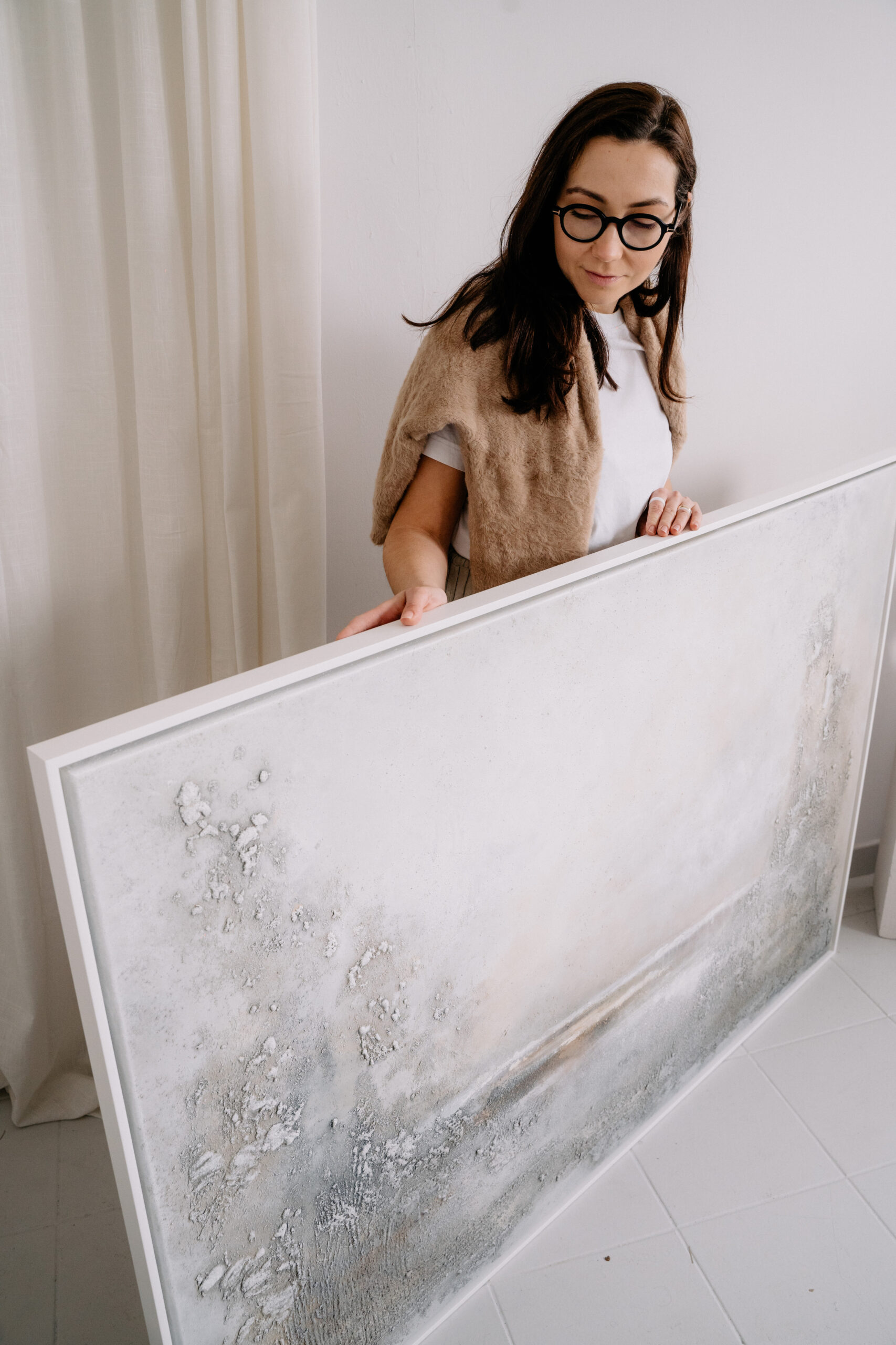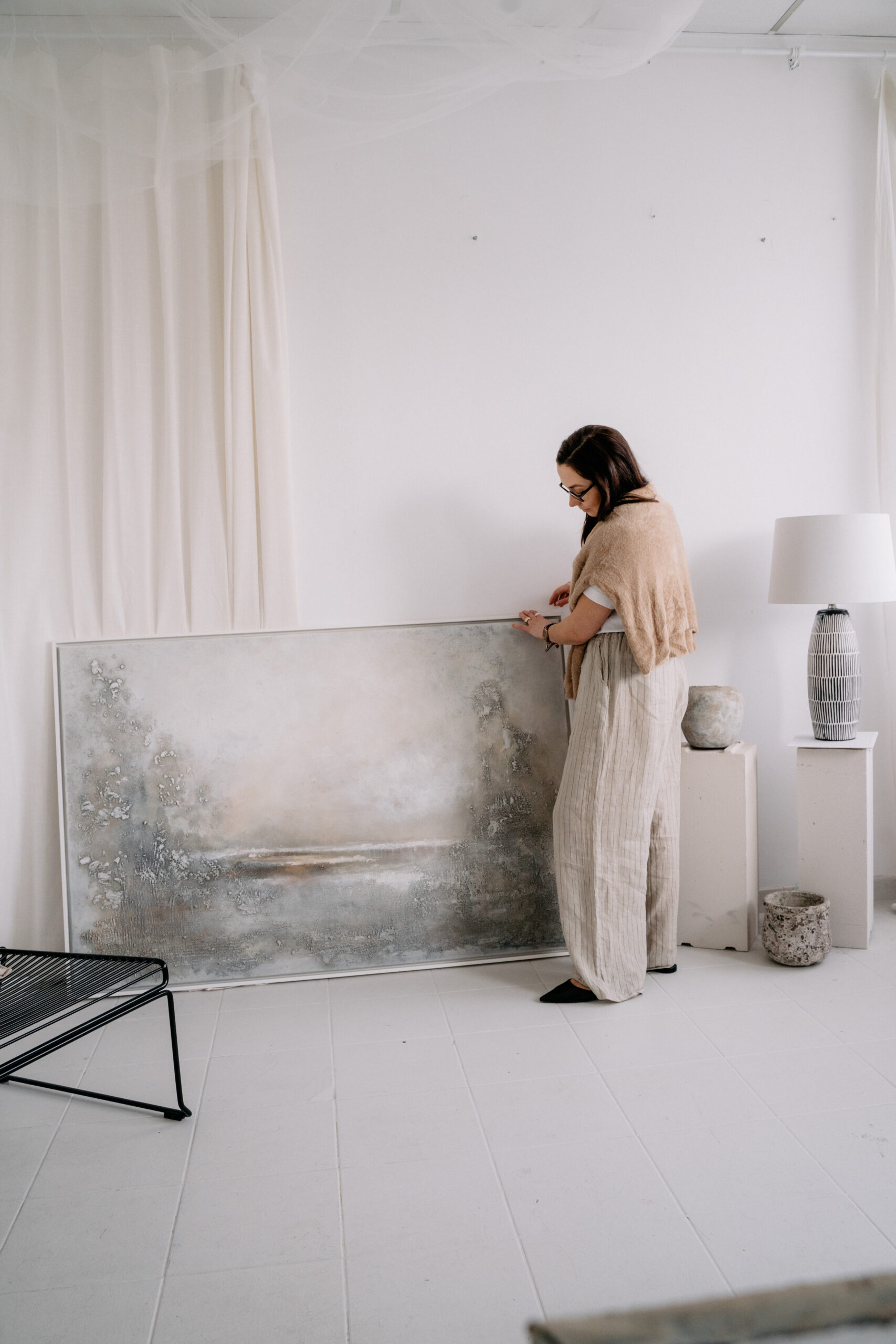 Obraz widoczny na zdjęciu, utrzymany w subtelnych odcieniach szarości, beżu i bieli, emanuje spokojem i introspekcją. Delikatne przejścia tonalne i fakturalna powierzchnia przywodzą na myśl poranną mgłę unoszącą się nad spokojnym morzem lub ciche wspomnienie zapisanego w pamięci miejsca. Szarości symbolizują równowagę, refleksję i dystans od zgiełku codzienności. To kolor kontemplacji, przestrzeni między światłem a cieniem, w której można odnaleźć ukojenie i klarowność myśli.